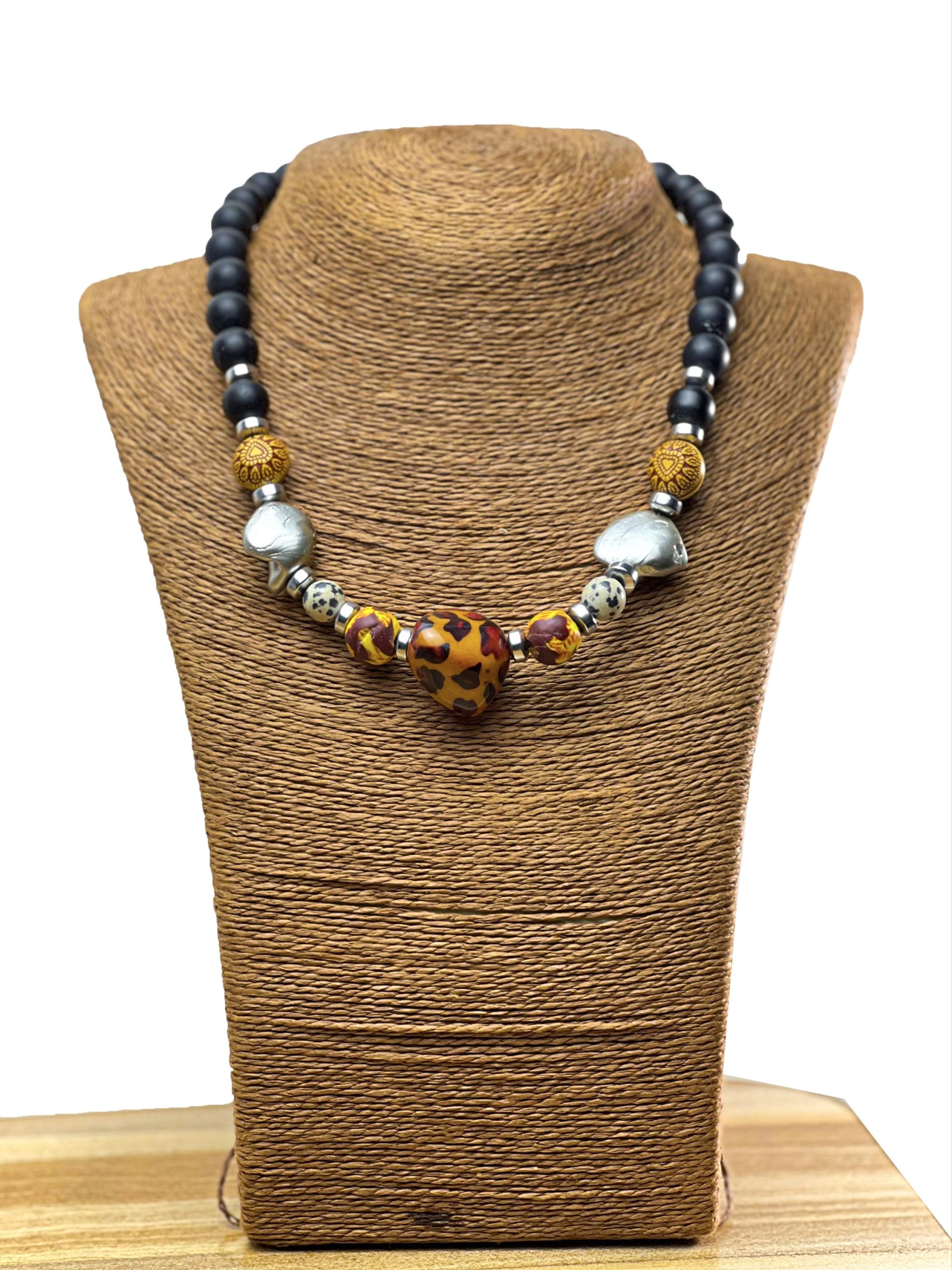 A beautiful combination of black beads, pearls, acrylic beads and Korobo beads with a nice touch of silver