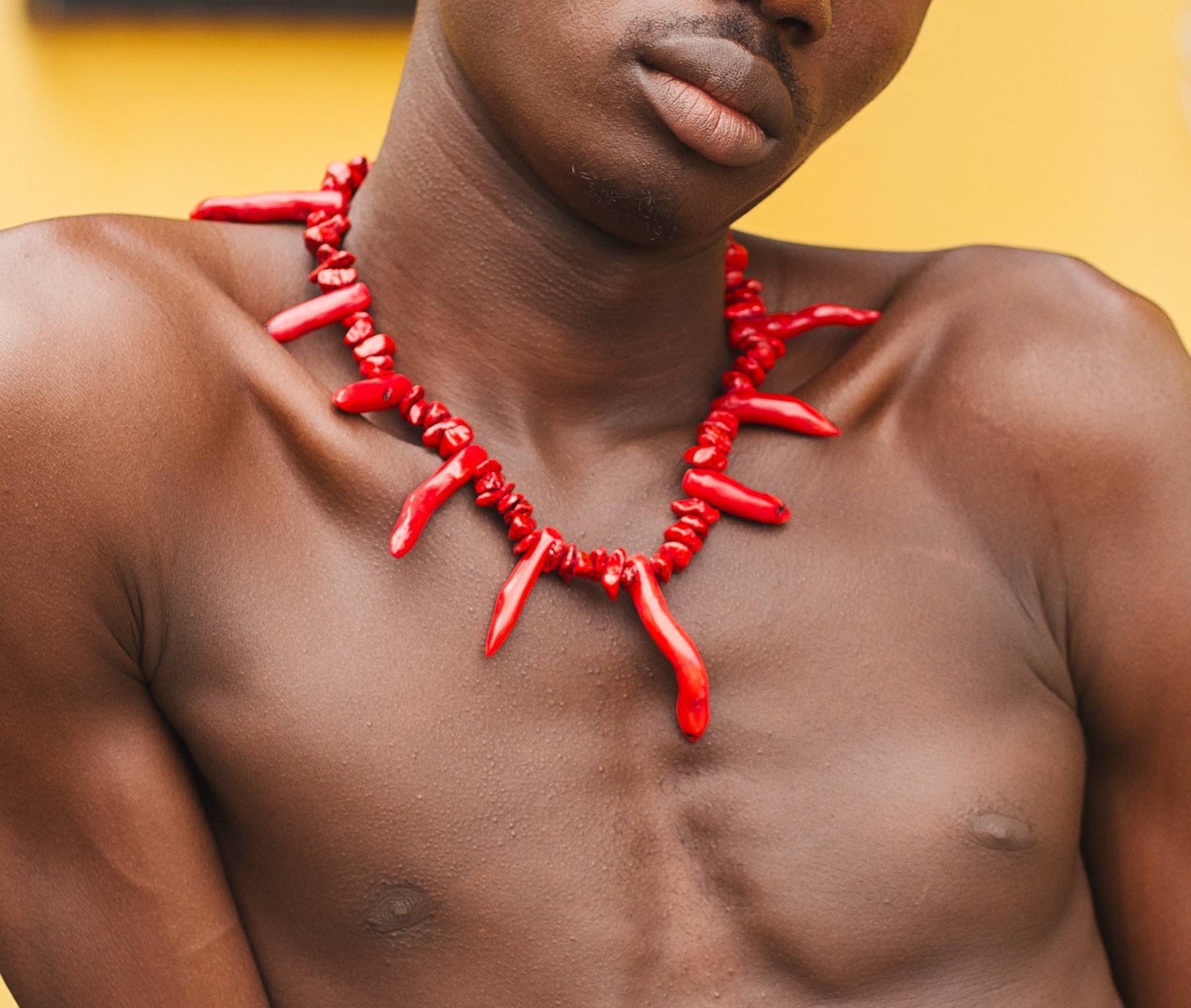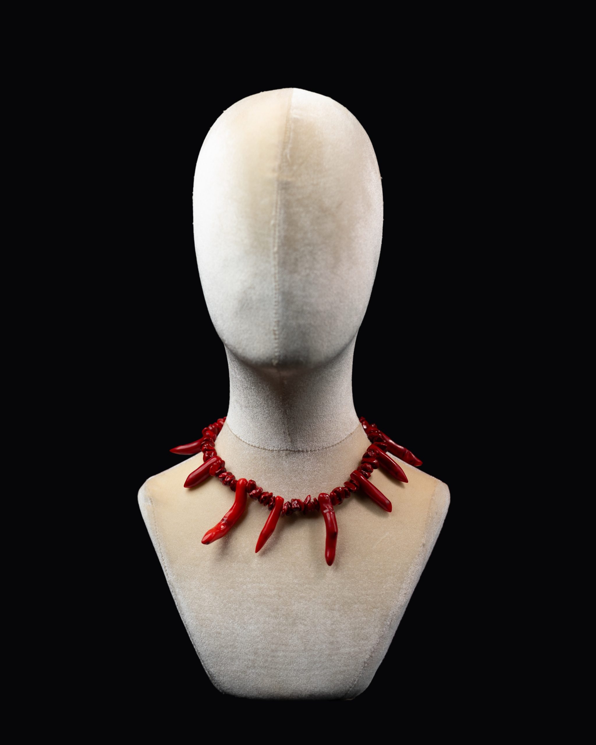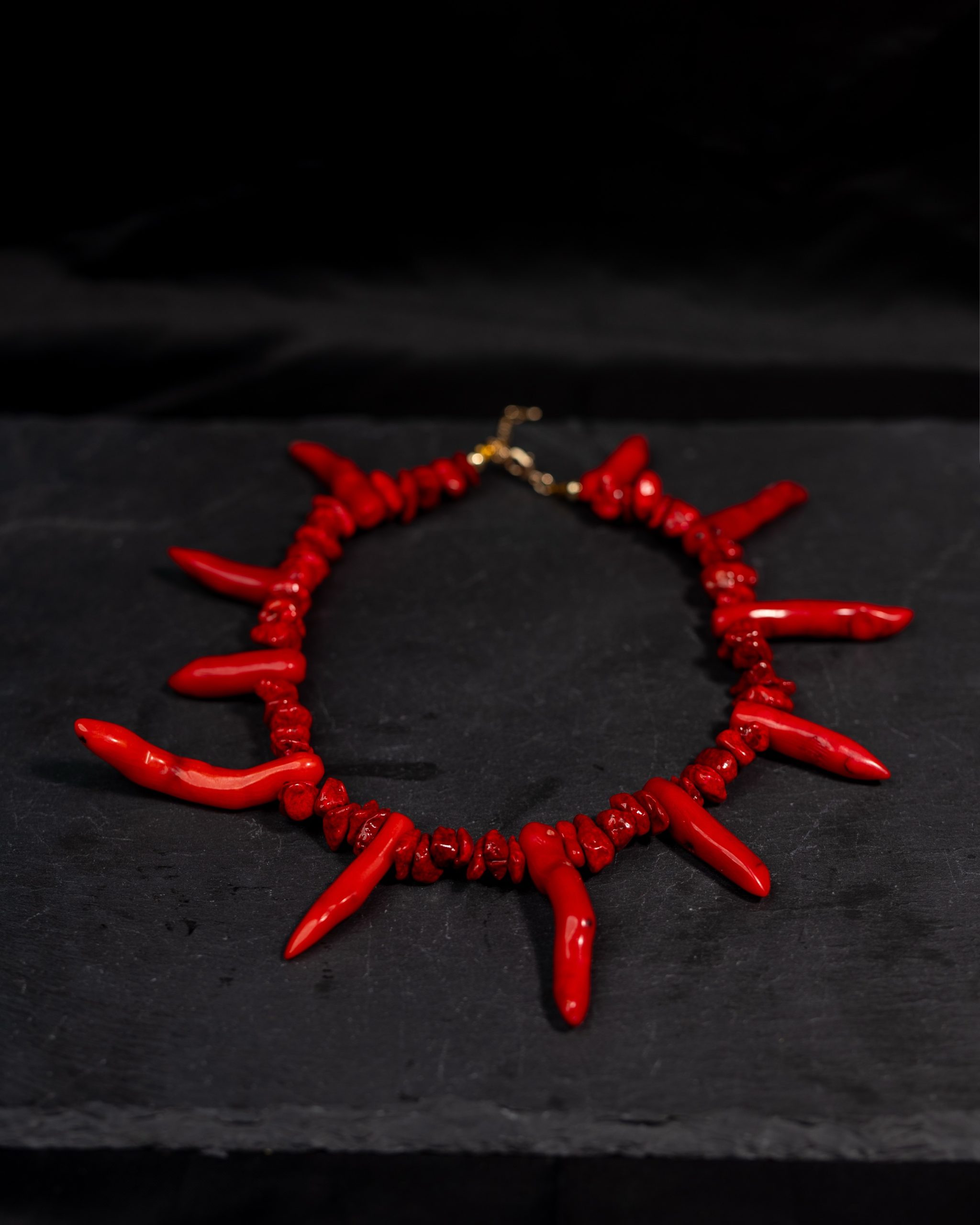 A bold statement piece handcrafted with striking red coral beads, each shaped to resemble natural roots and spikes.