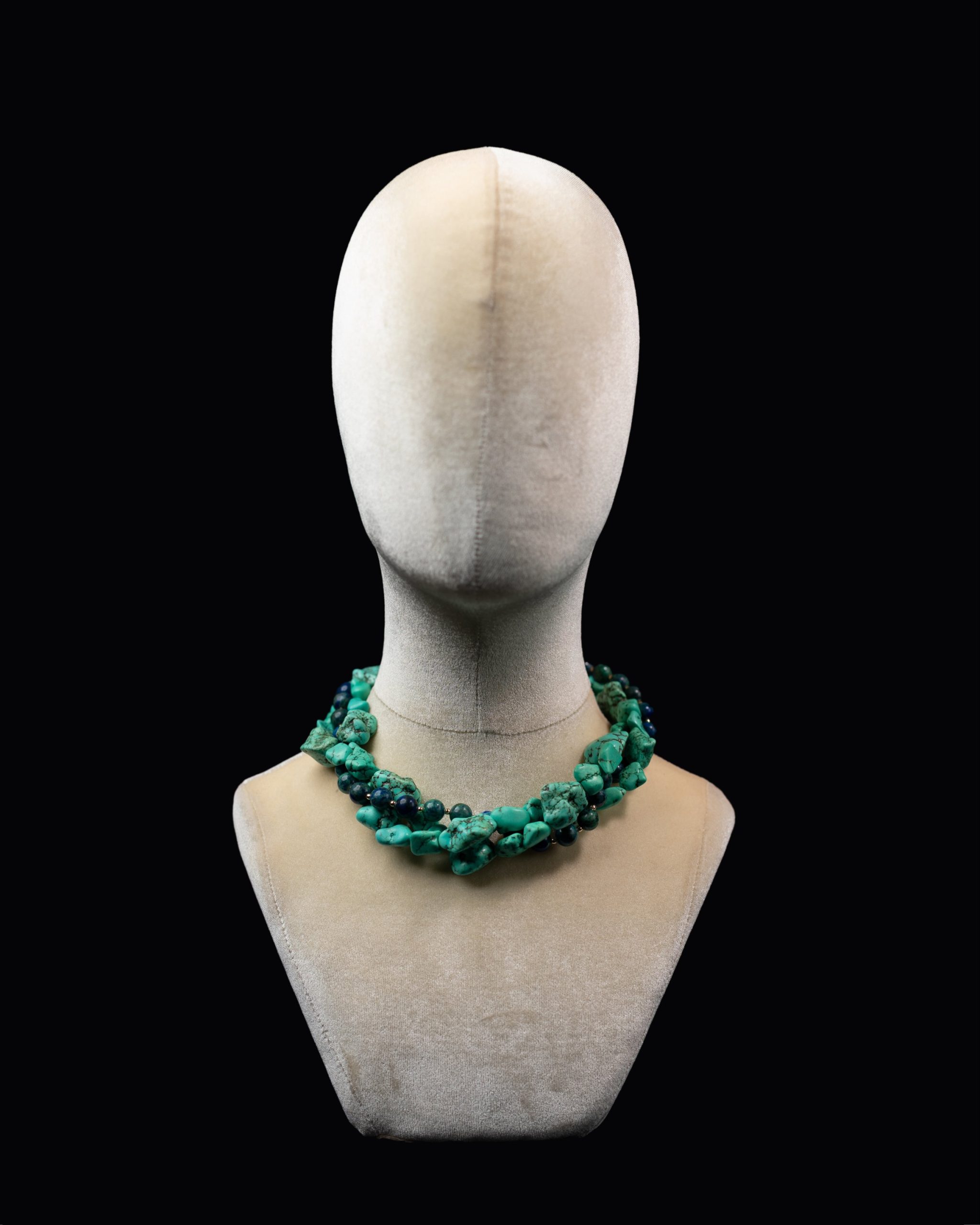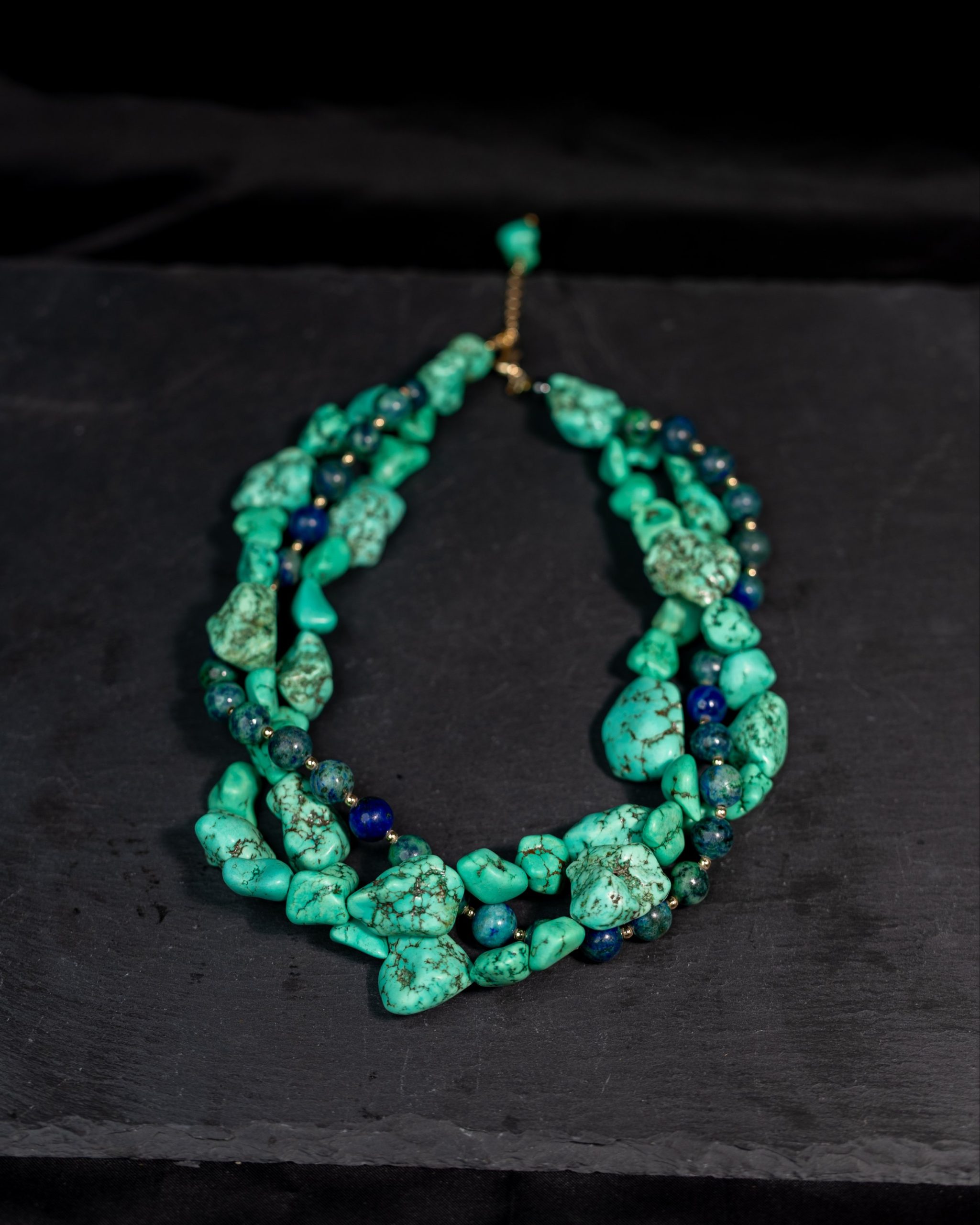 The Ewa Twist necklace features three richly braided strands of genuine turquoise gemstones. Designed to make a striking statement while carrying the calming, grounding energy of turquoise.
