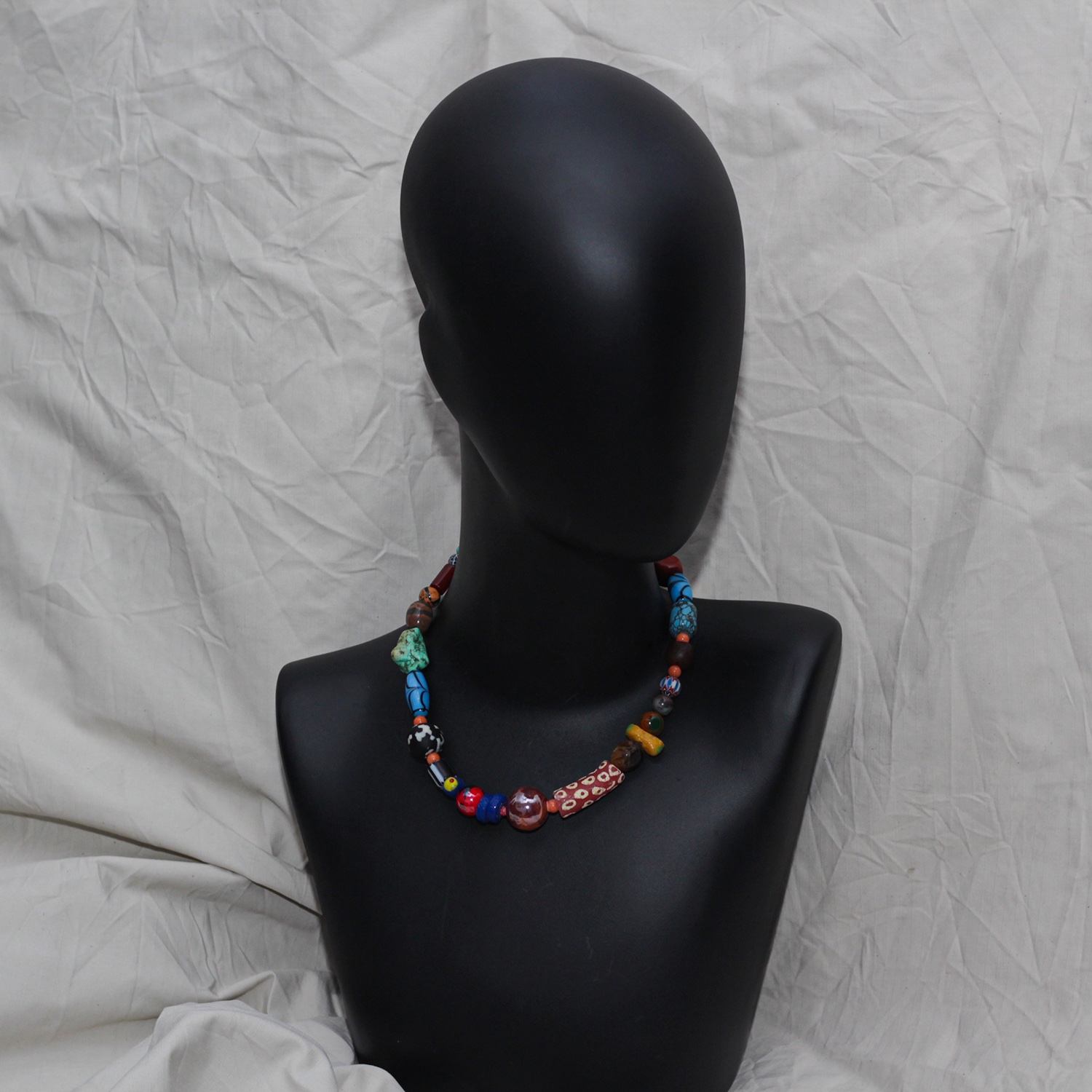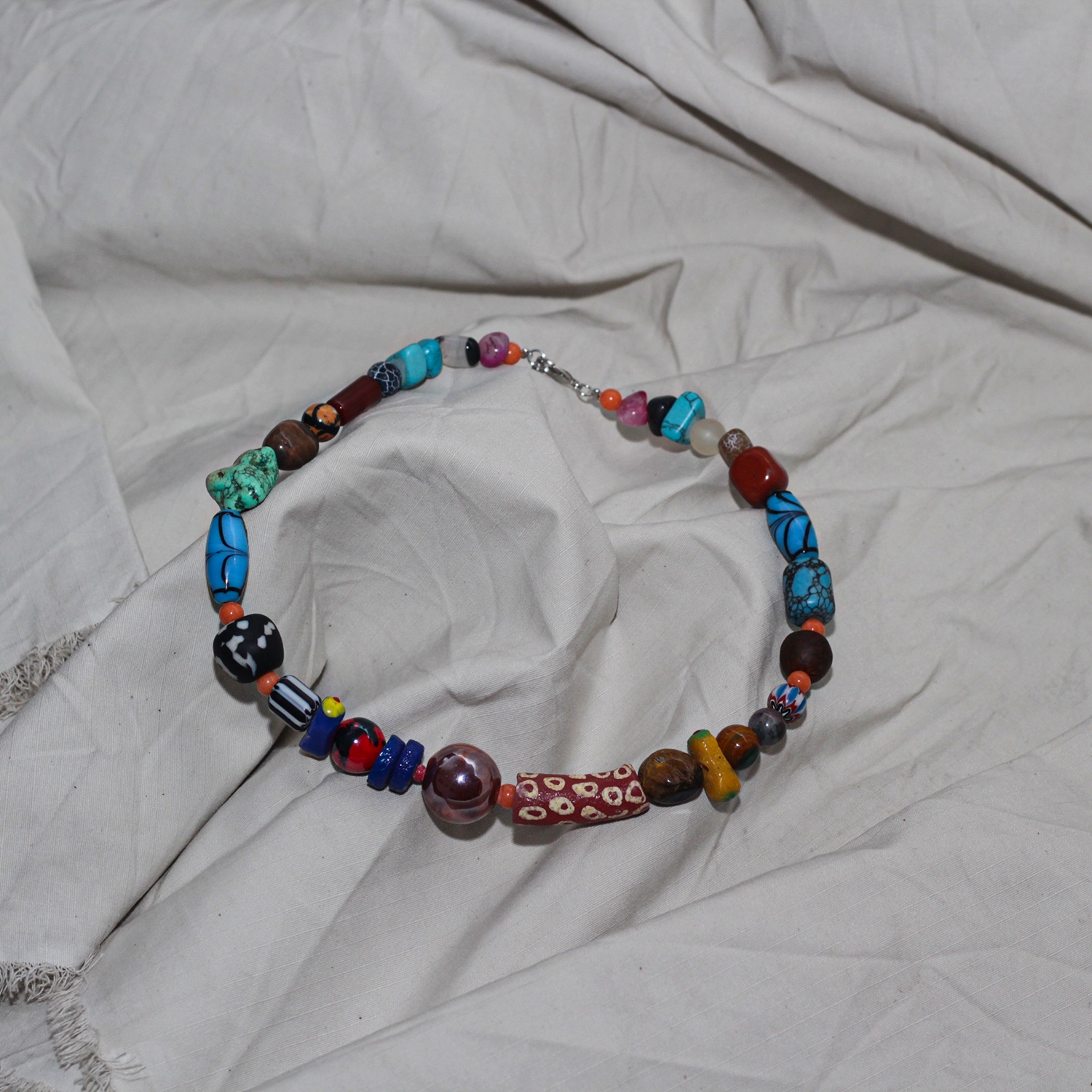 Discover the ‘Timbuktu Treasure’ necklace, a vibrant blend of gemstones, Ghana beads, and African treasures. Handcrafted with love, this unique piece combines earthy tones, bold textures, and exotic flair for a truly eye-catching accessory.”