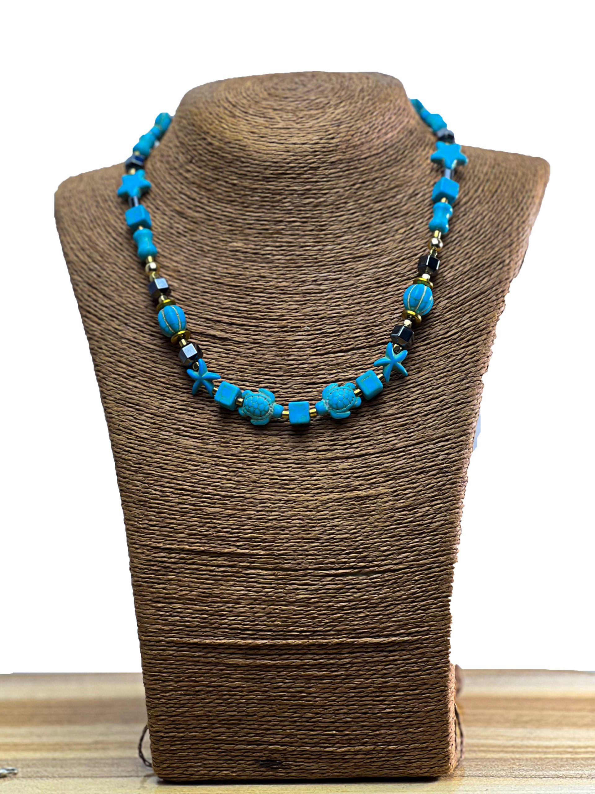 Made with beautiful turquoise beads in different shapes and sizes with a touch of gold and silver accessories