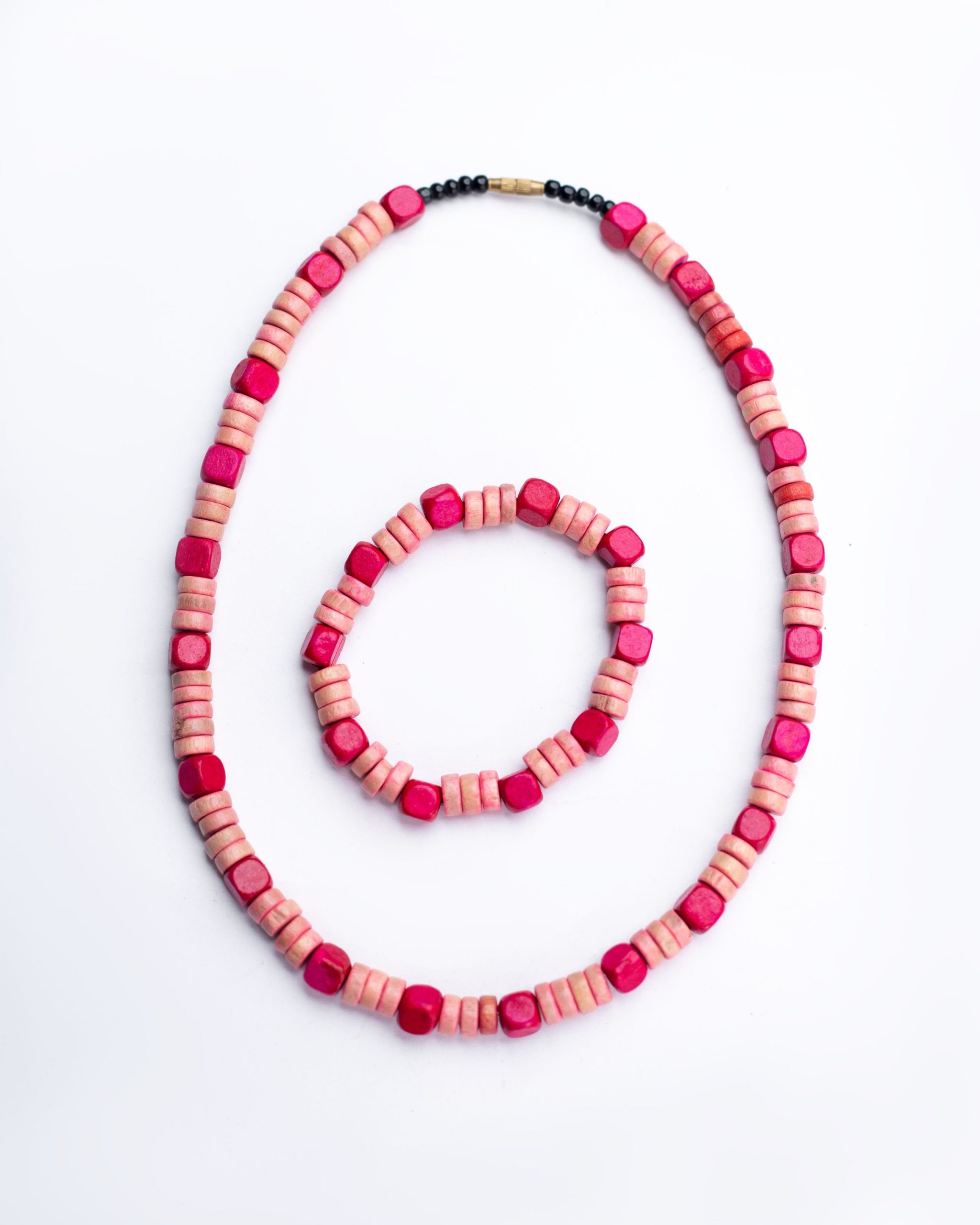 A beautiful jewelry set made with pink wood beads
